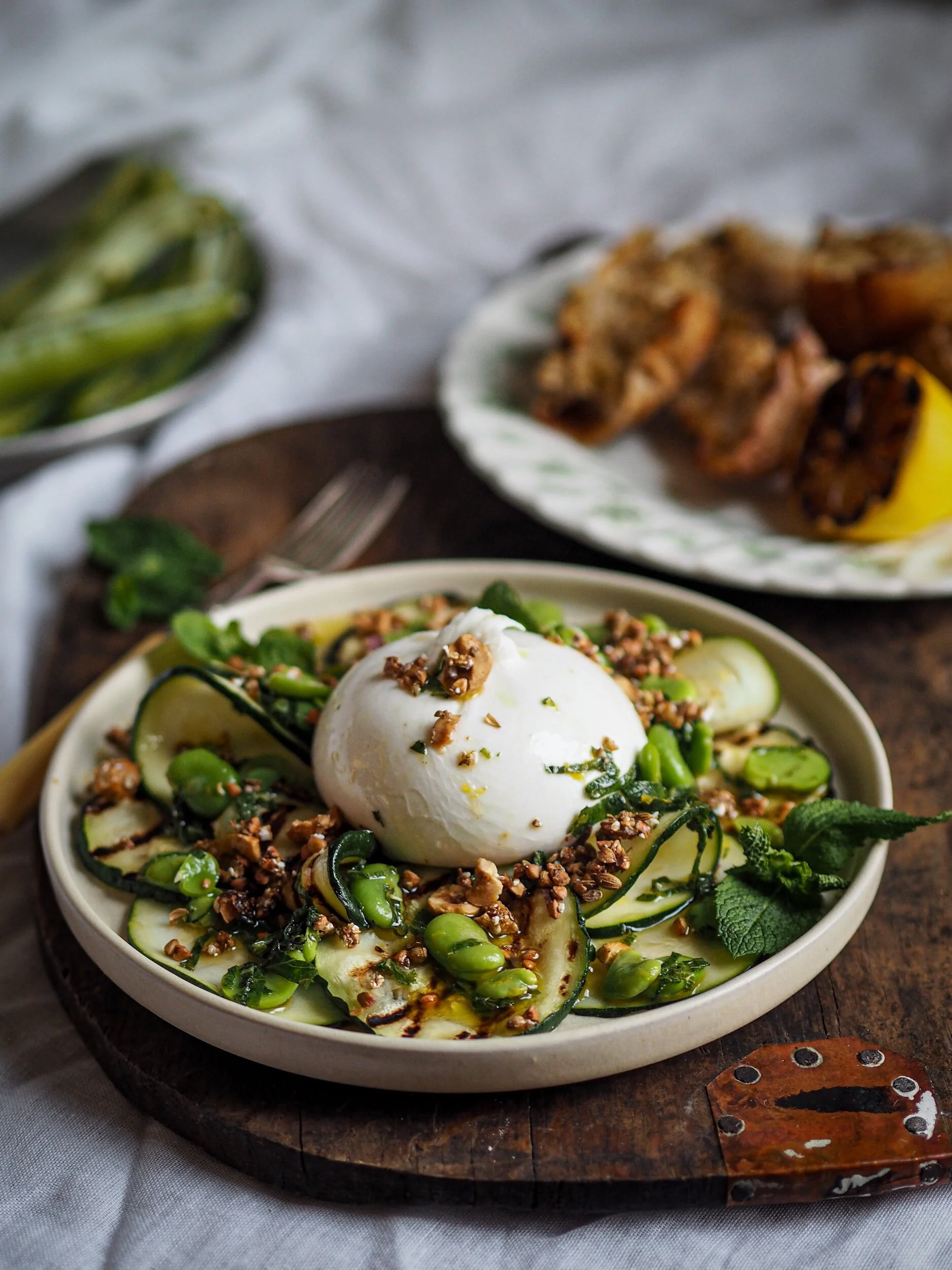 Burrata with grilled and raw courgette, broad beans, burnt lemon vinaigrette and buckwheat dukkah