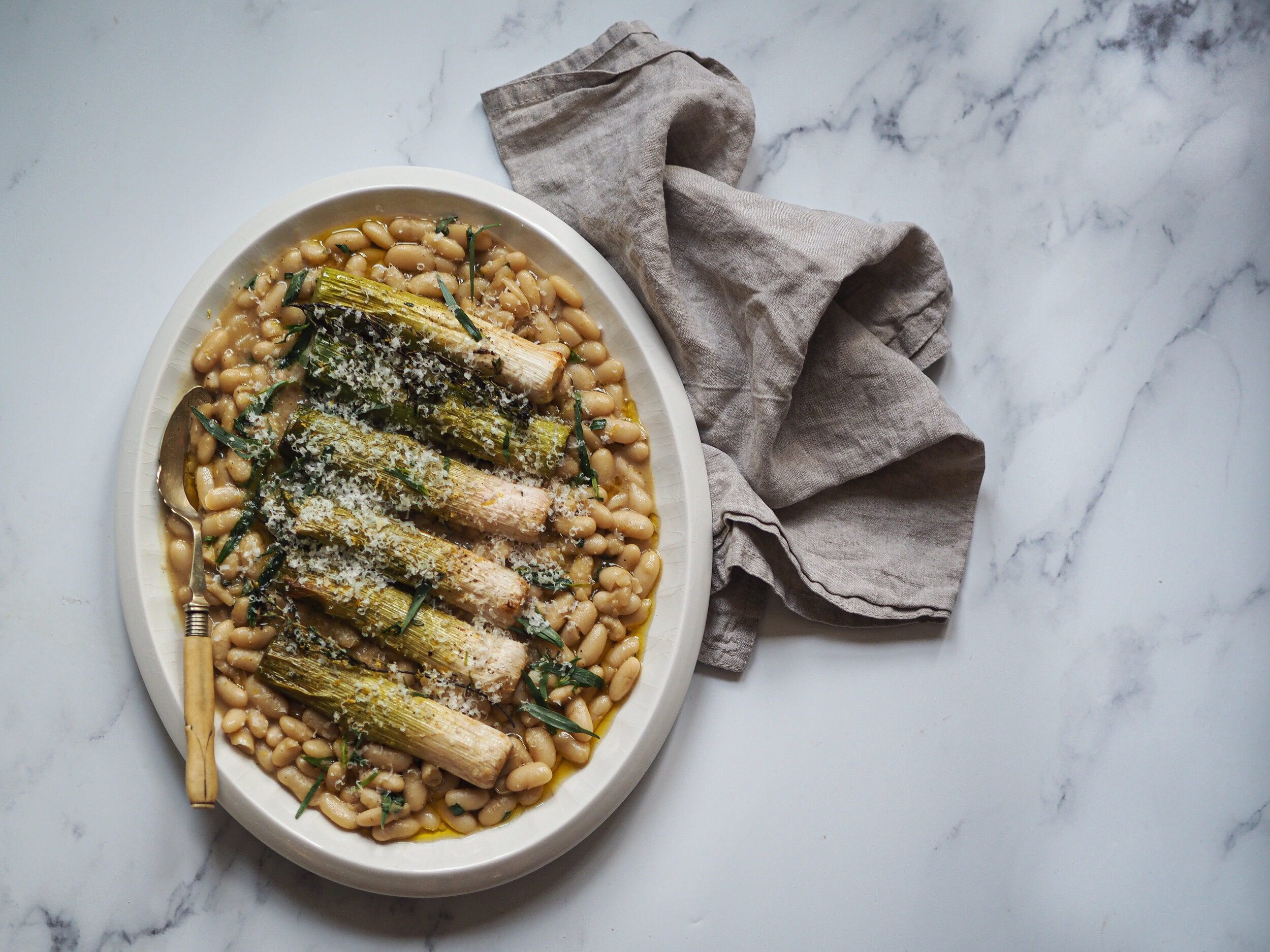 I like to serve the beans in a shallow platter with the leeks on top, grated lemon zest, a good glug of good olive oil and an extra grating of parmesan.