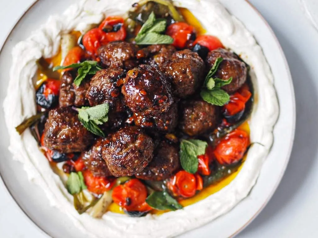 To plate: distribute the labneh onto a big deep plate, divide the onions and tomatoes on top. Place the meatballs on top and pour the chilli butter over.