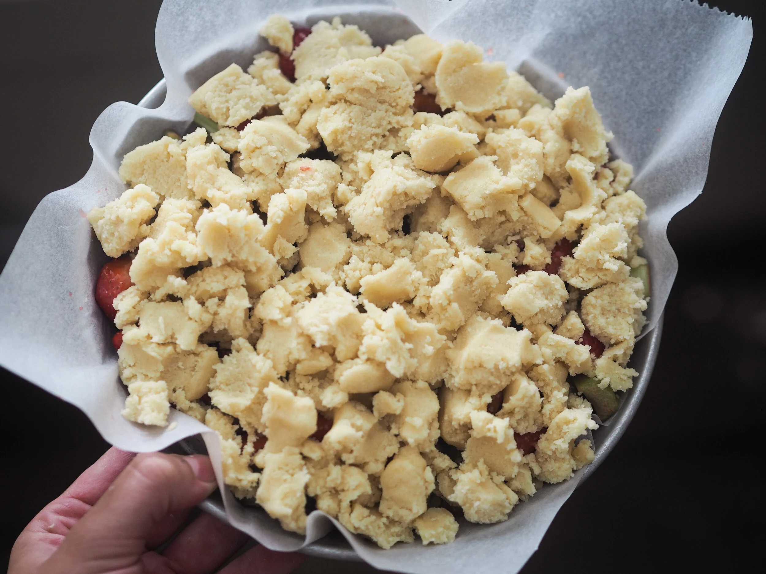 The fruit layer can be swapped to any fruits or berries in season, personally I am a sucker for this combo. You can even sneak in pieces of white chocolate in the topping.
